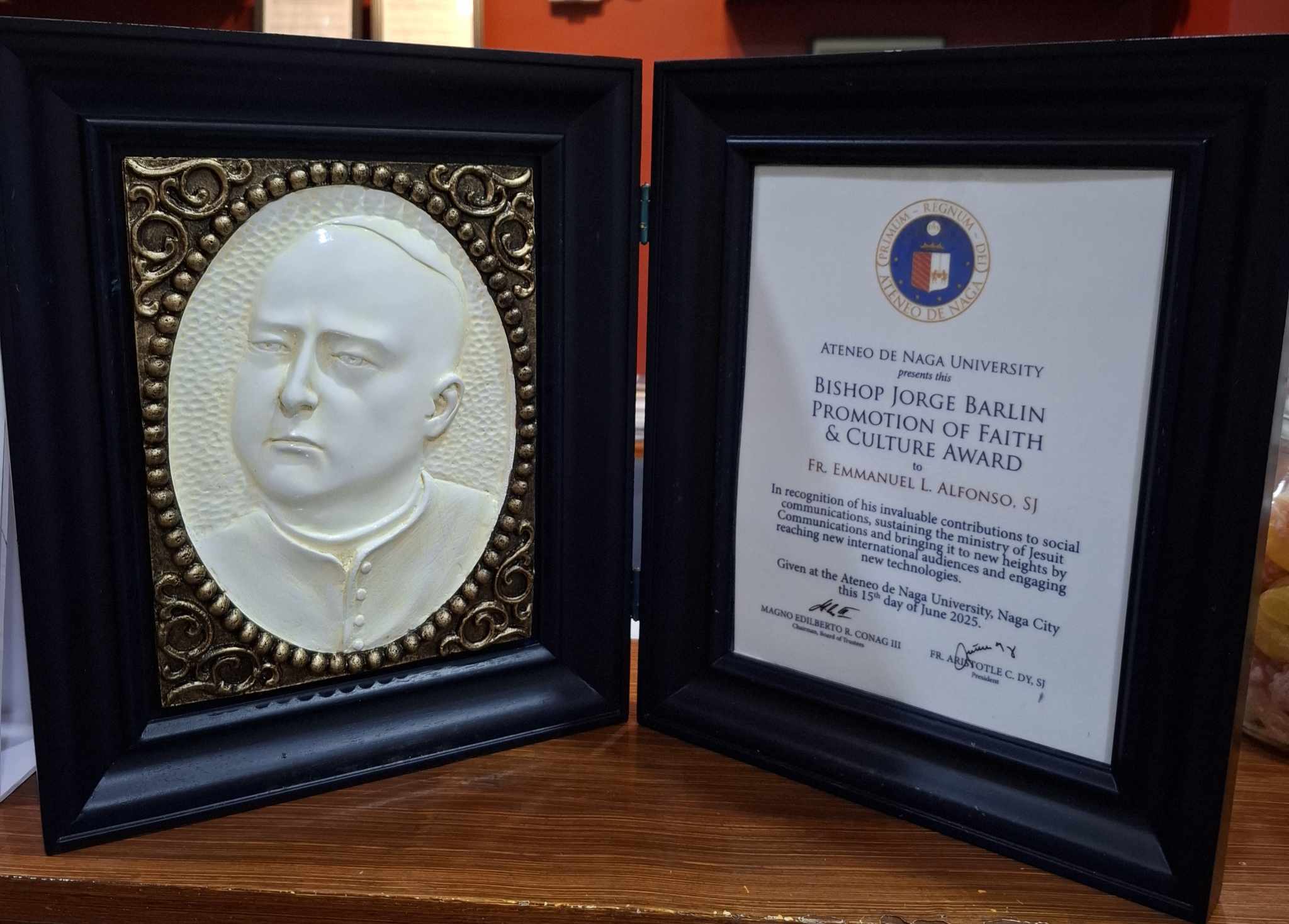 (JesCom Executive Director, Fr. Nono Alfonso, SJ, received the Bishop Jorge Barlin Promotion of Faith and Culture Award from the Ateneo de Naga University on June 15, 2024.